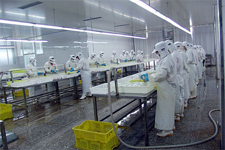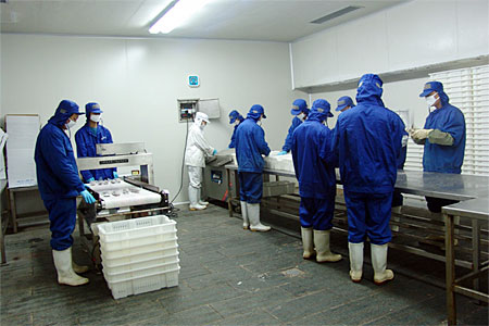 本公司是一家以水產品加工為主的出口型企業(yè),于2004年9月建成并正式投產。公司廠房完全按照歐洲聯盟的標準設計施工,目前占地14000平方米,建筑面積8000平方米,其中加工車間1600平方米。公司日速凍能力達100噸,儲藏庫容量為5000噸,主要加工蟹類、貝類、頭足類及魚蝦類水產品,產品銷往日本、東南亞及歐盟地區(qū)。